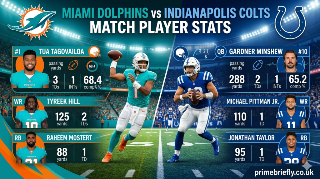 In this detailed article, we will explore the complete miami dolphins vs indianapolis colts match player stats, including quarterback performance, rushing and receiving leaders, defensive impact, turnovers, game-changing moments, and overall team efficiency.