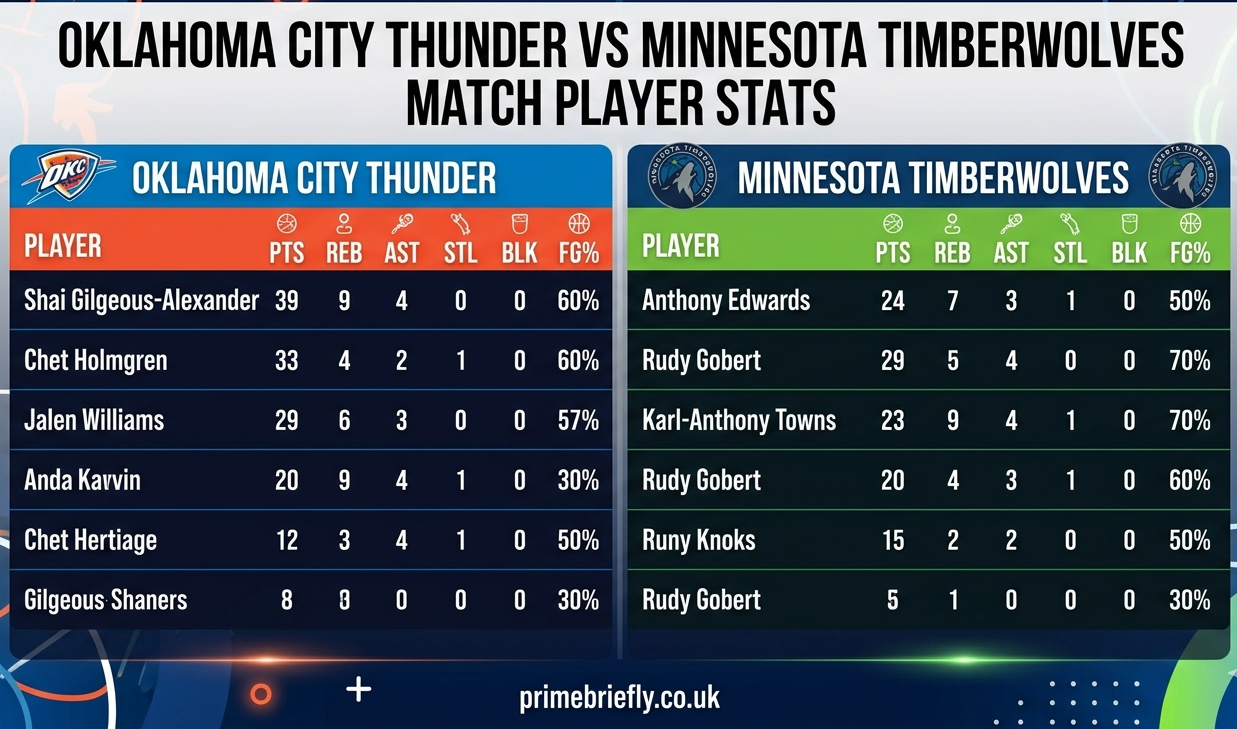 The focus on Oklahoma City Thunder vs Timberwolves match player stats highlights not just scoring, but also efficiency, defensive pressure, rebounding battles, and bench contributions.